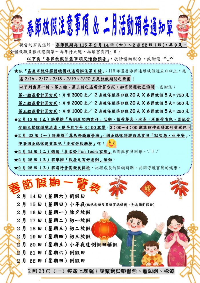 首頁 > 園所公告 > 春節放假注意事項 & 二月活動預告通知單