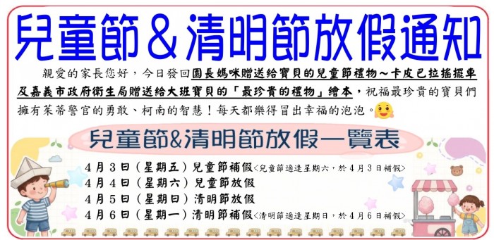 首頁 > 園所公告 > 兒童節&清明節放假通單