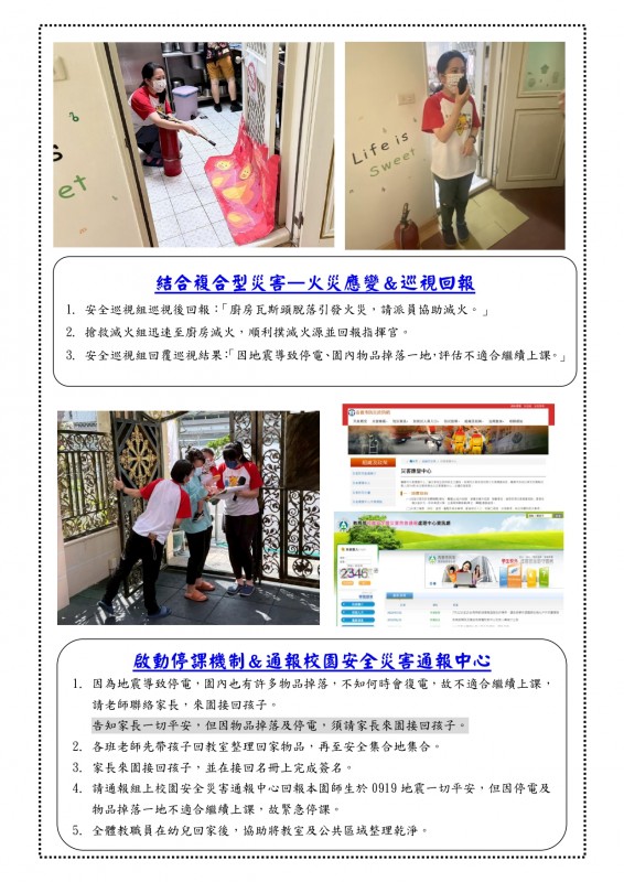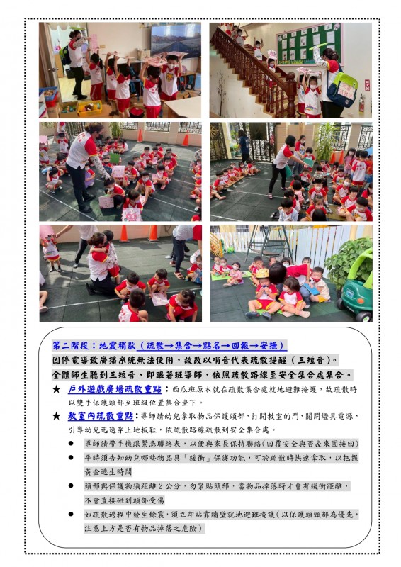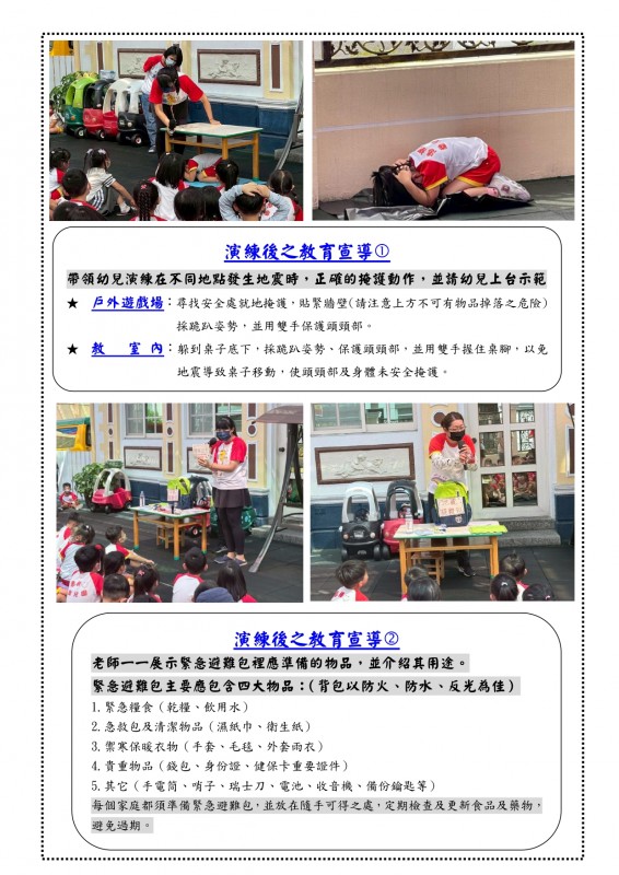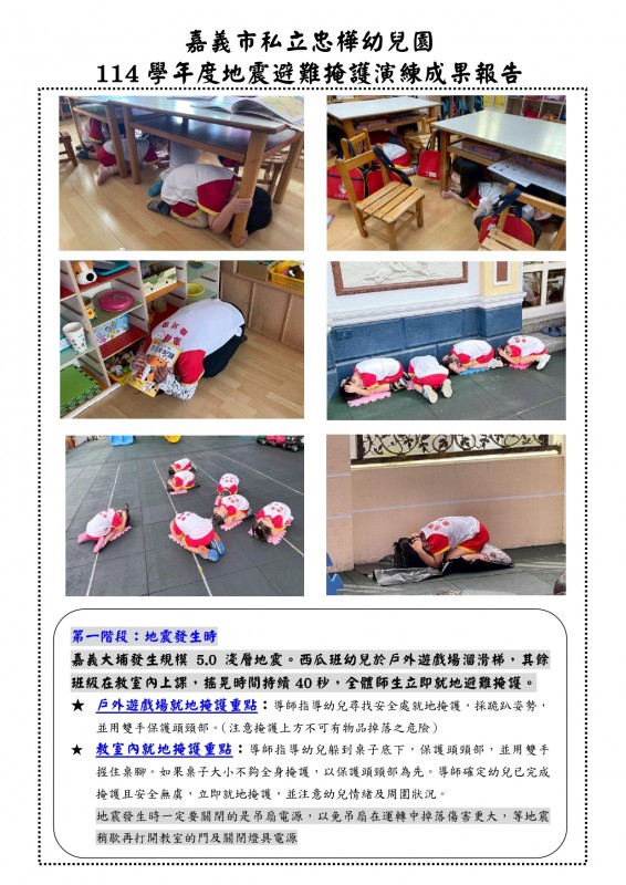 配合行政院「國家防災日」活動,每年九月全國各級學校皆須實施兩次地震避難掩護演練(包含震後疏散避難),熟稔「趴下、掩護、穩住」抗震保命三步驟,強化師生在各種情境發生地震時的應變處理能力,以期在災害來臨時,能夠有效降低災害損失,保護全體師生安全。